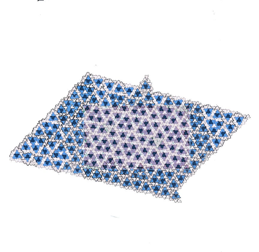 Comparing my pattern (blue) to the reported tessellating pattern (red), which is overlaid with 50% transparency, shows that six triangles in the lower left corner were rotated by 120 deg, so the central hat orientations differ for those six. Without that there would have been gaps in my hexagonal pattern