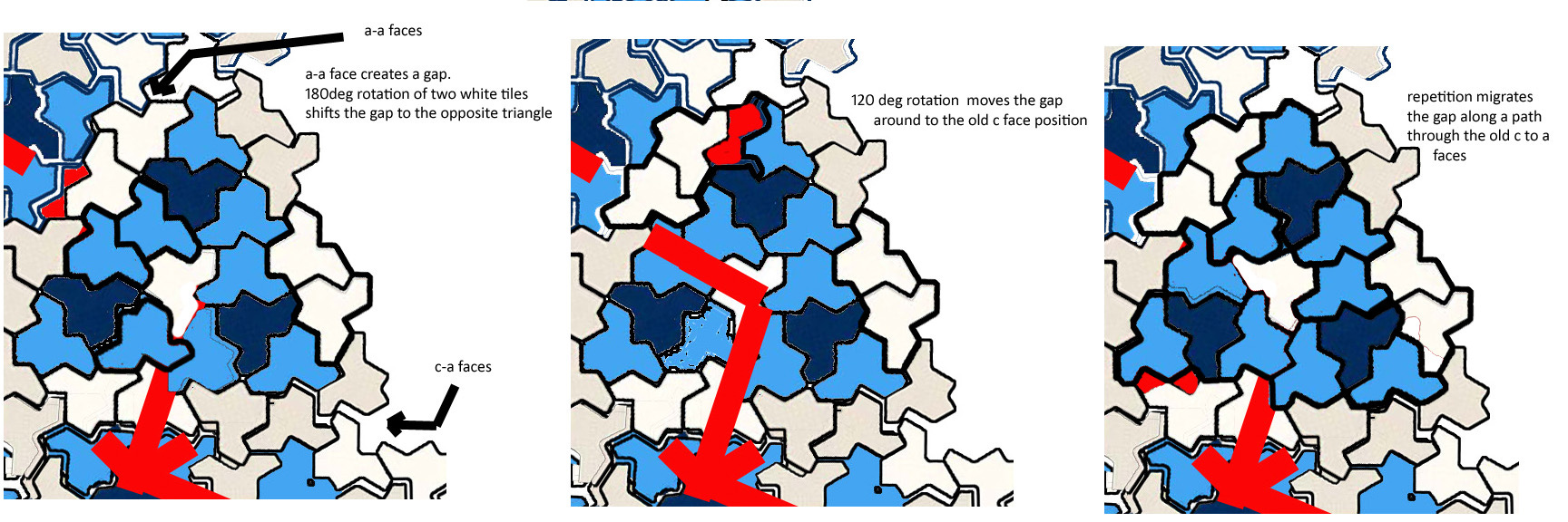 .My continuation of the reported fragment of the tessellating pattern must have deviated from the true pattern at some point. That occurred early on, when a gap appeared and I migrated it out. For gap migration see the red double diamond, which is moved by performing a 180deg rotation of two neighboring white tiles which allows the gap to hop from one triangle to the triangle opposite, across an a-a edge facing space. Rotating the tile 120deg migrates the gap round the triangles edge to face another triangle. If there is a sequence of a-c edges forming a path to the edge of the growing pattern the gap can be eliminated, otherwise it is trapped and the pattern cannot tessellate.