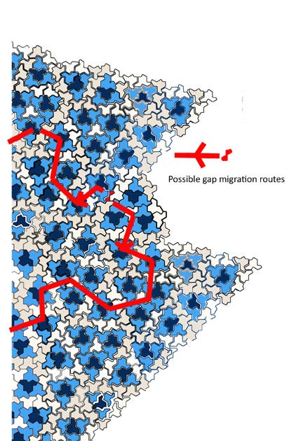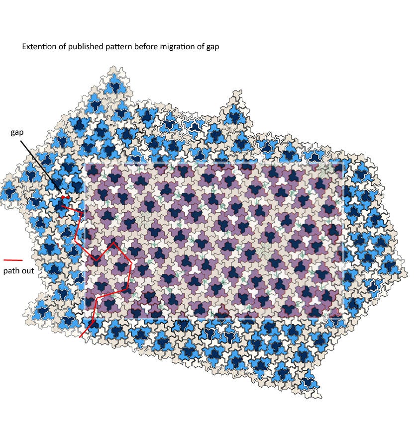 .An alternative to eliminate the gap is to adopt a different continuation of the pattern which doesn’t interfere with the original fragment . A continuation which maintains the single files of 4tile triangles and notes that the number of such triangles between the six tile grey triangles depends on the grey triangles relative orientation: same (both point down or up) 5, 4tile triangles; different (up-down or down-up) 4 such triangles. The rule to avoid a-a facing edges is followed throughout. A unique continuation of the fragment is then found:
