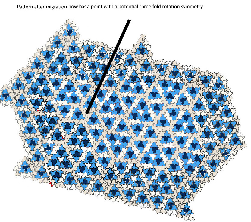 The further expansion of the pattern which gave the C3 point group symmetry tiling of about 2375 tiles, encountered a problem. The three shorter sides of 10, 4-tile triangles, force the continuation shown below. This produces a gap which cannot be migrated out of the pattern by local adjustments of the surrounding tiles
