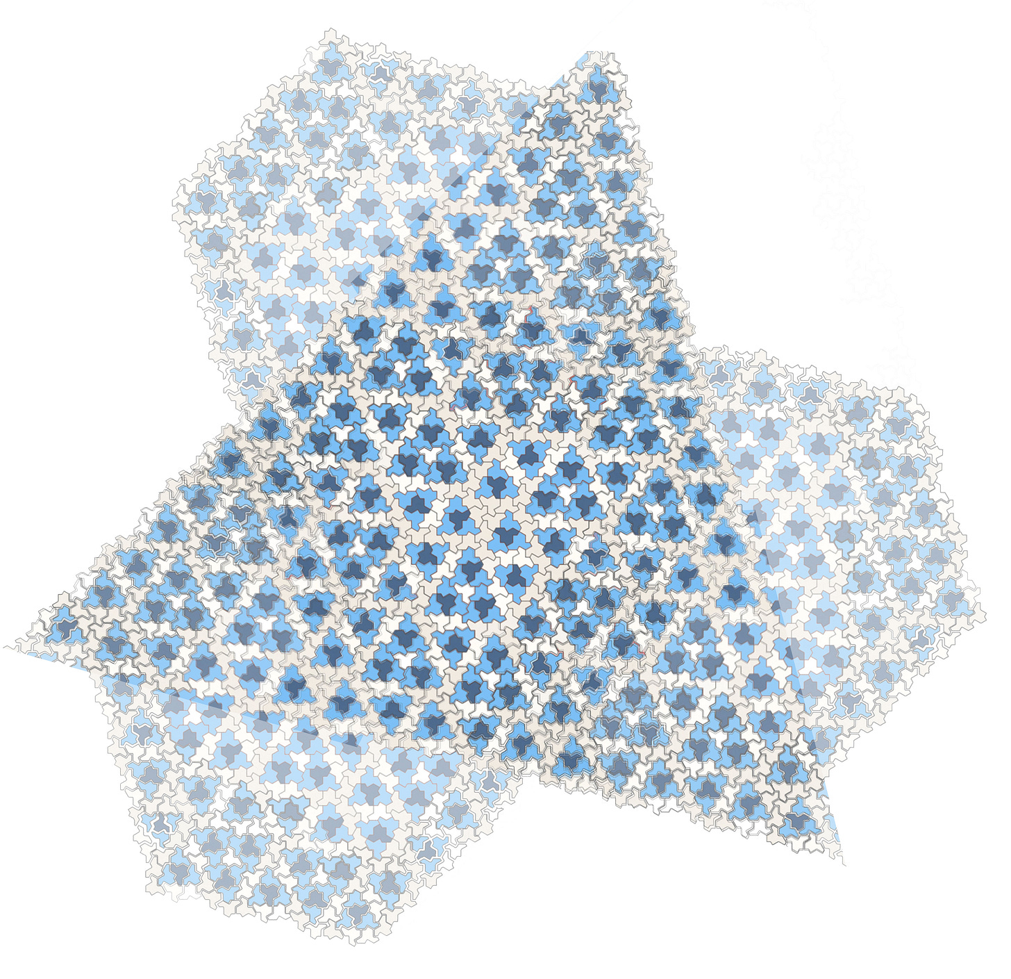 The fragment of the hat tile tessellation reported on the Guardian website, is a pattern which looks as if it may have a threefold axis of rotational symmetry about one point at the center of a six tile grey triangle. To test this, I expanded the pattern avoiding any gaps then made three copies of my extended pattern, which are superimposed each rotated by 120deg (each with 33% transparency) about the point the tentative threefold axis passes through. The result shows that the growing pattern does have point group symmetry C3, at least as far as it is developed