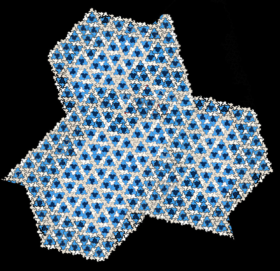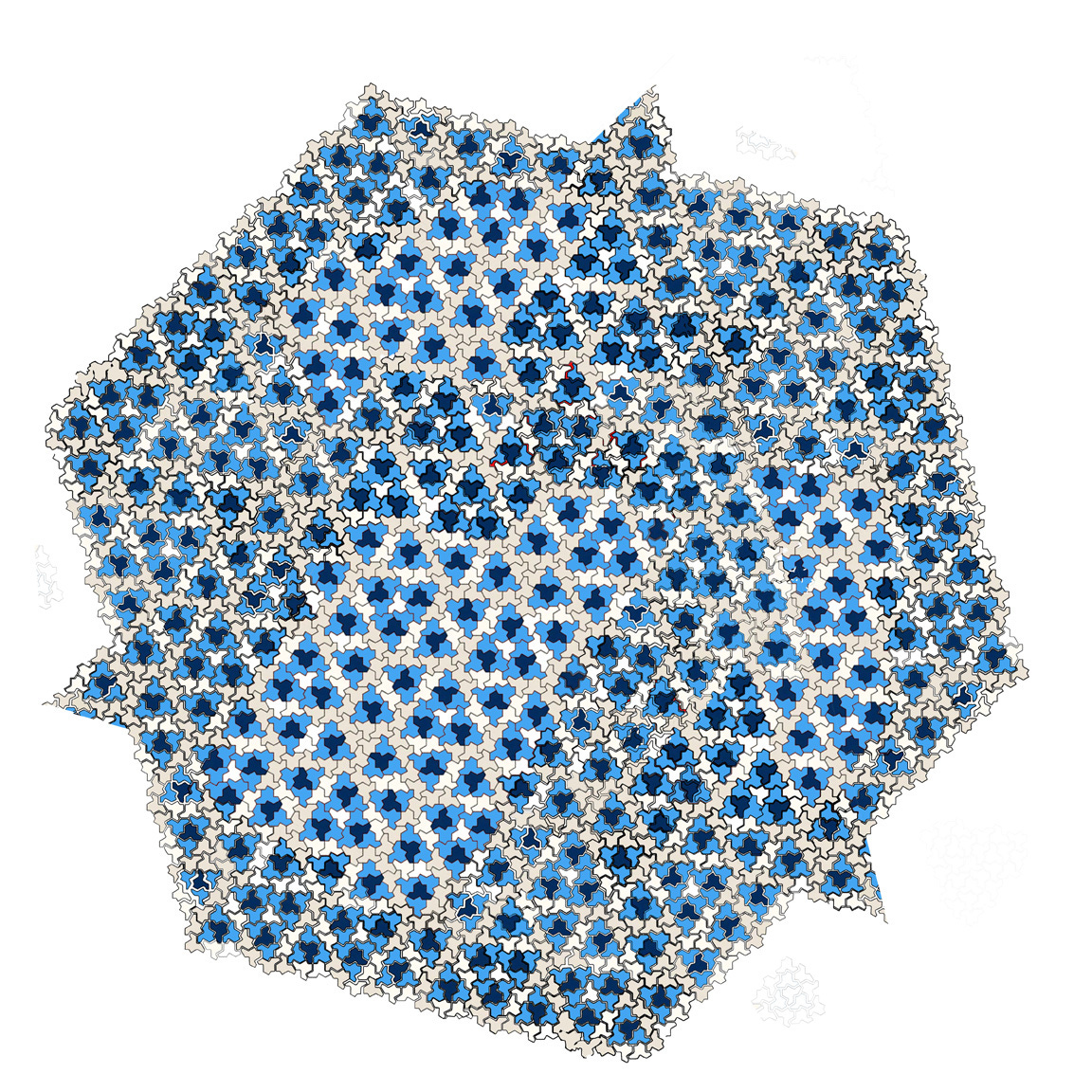 :Further expansion is possible without gaps forming, retaining the threefold symmetry about the center point, making it probable that the whole tessellation of the plane has this symmetry